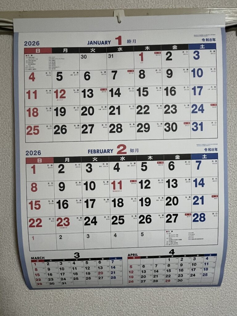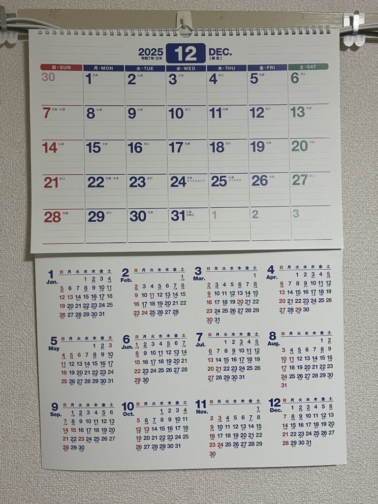 しかし、今年は変更。近所の書店で、いい感じの壁掛けカレンダーを見つけたのです。くるくる巻いてあるタイプなので、持ち帰りも便利で、値段も1000円以下でお得。