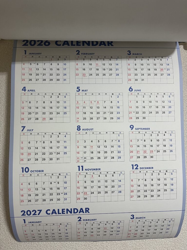 そして最終ページには、なんと、一年分と来年の1〜3月までの年間カレンダーが付いていました。これを取り外して別に掲示すれば、私の好きな年間カレンダーも見ることができます。素晴らしいカレンダーを見つけたと思います。メーカーが書いていなかったのですが、ネットで検索したら、九十九商会という、創業75年の老舗企業のカレンダーでした。