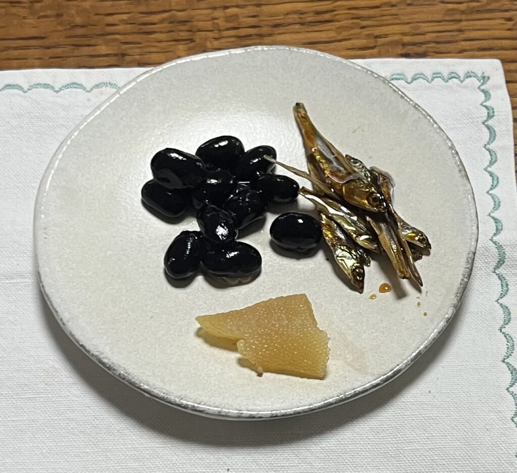 こちらは、黒豆・田作り(ごまめ)・数の子です。これは「祝い肴(いわいざかな)」と言って、おせちの基本となるものなんです(西日本では、田作りや黒豆の代わりに、たたきごぼうを用いることが多いです)。