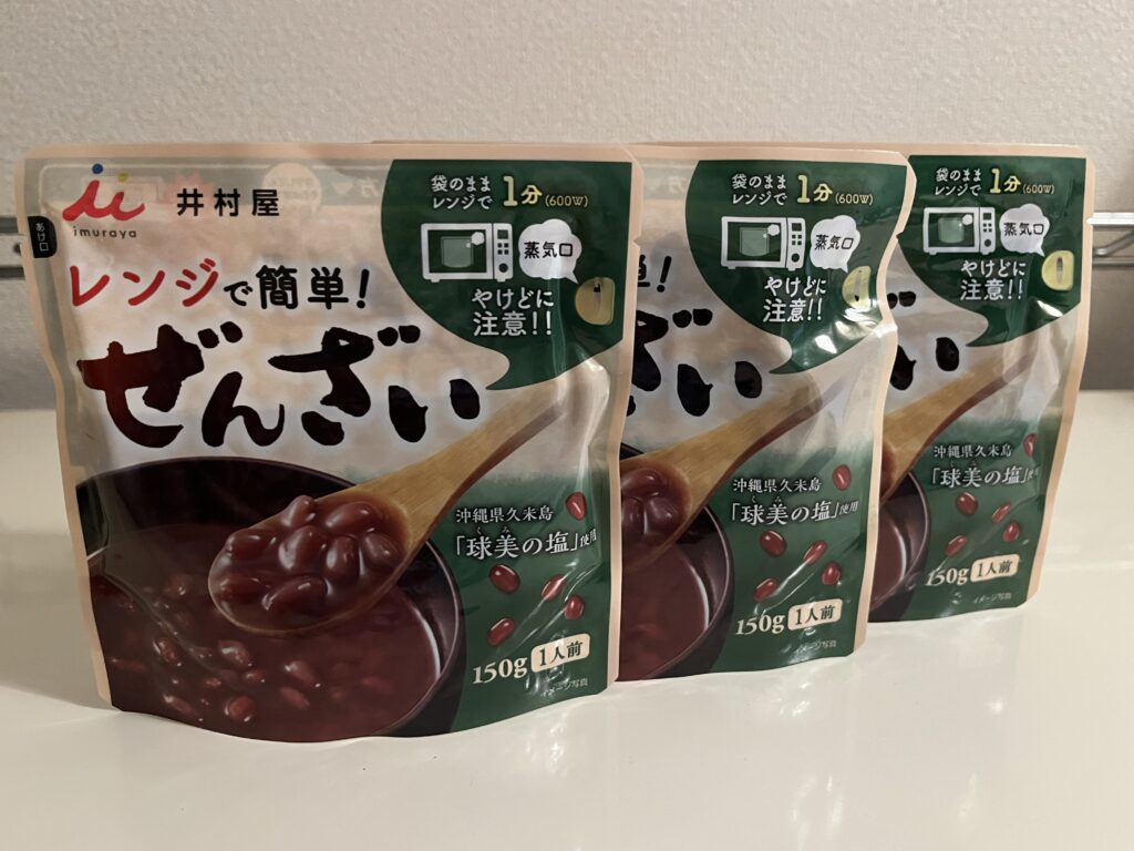 井村屋の『レンジで簡単!ぜんざい』を3つ購入。パウチ袋のままレンジでチンできる、便利な商品です。