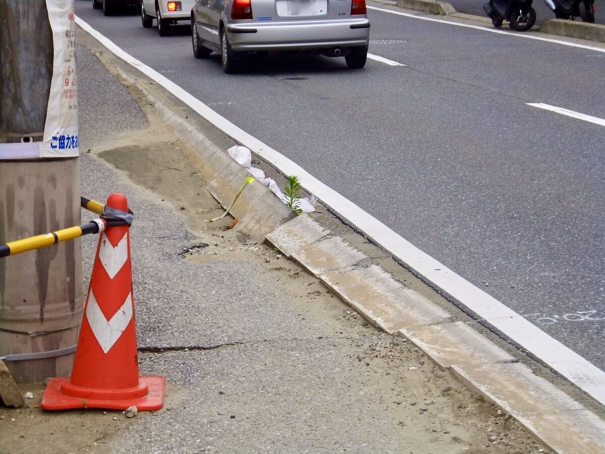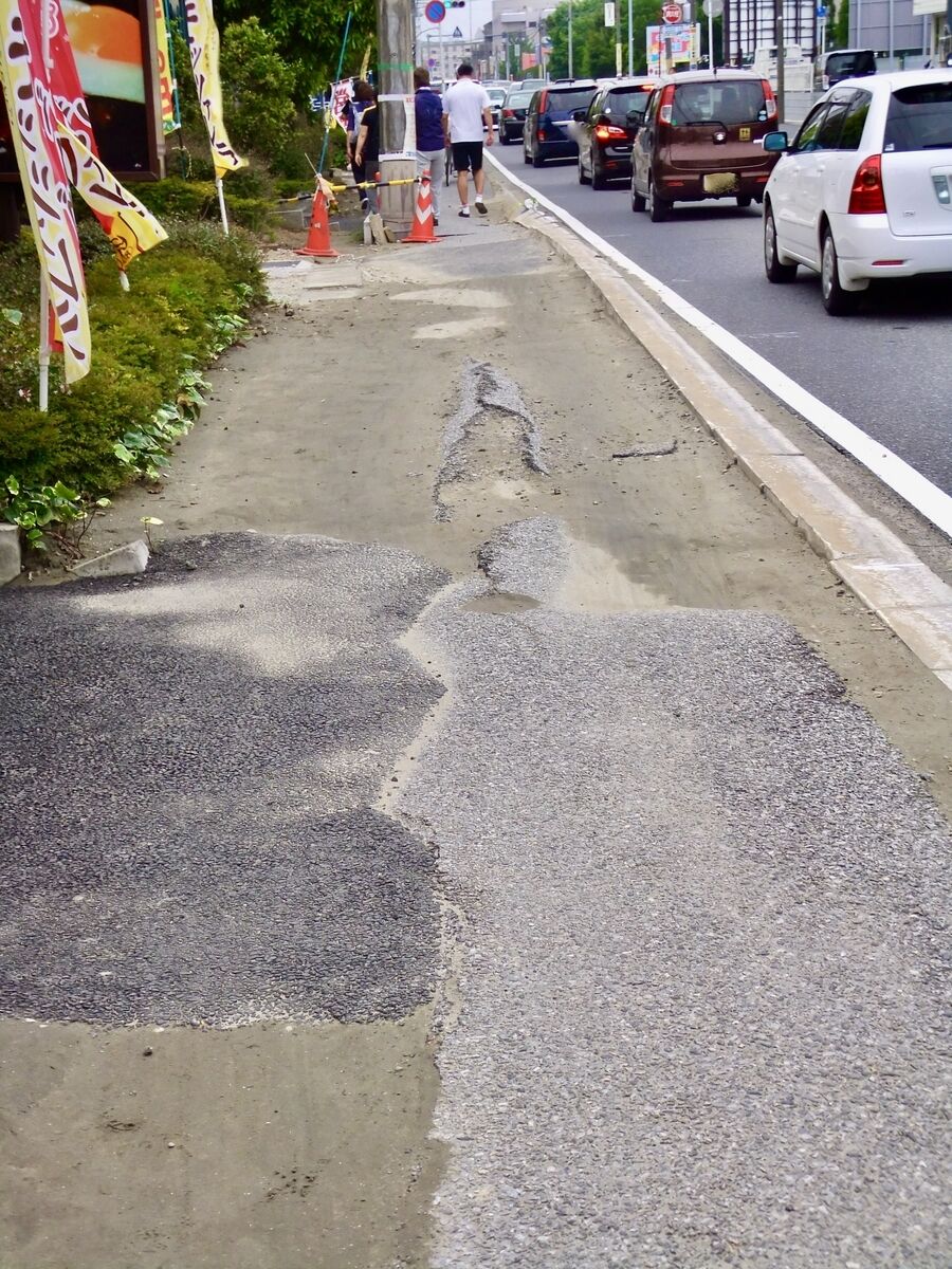 地震の発生から3ヶ月経っても舗装し直されない歩道の様子です。